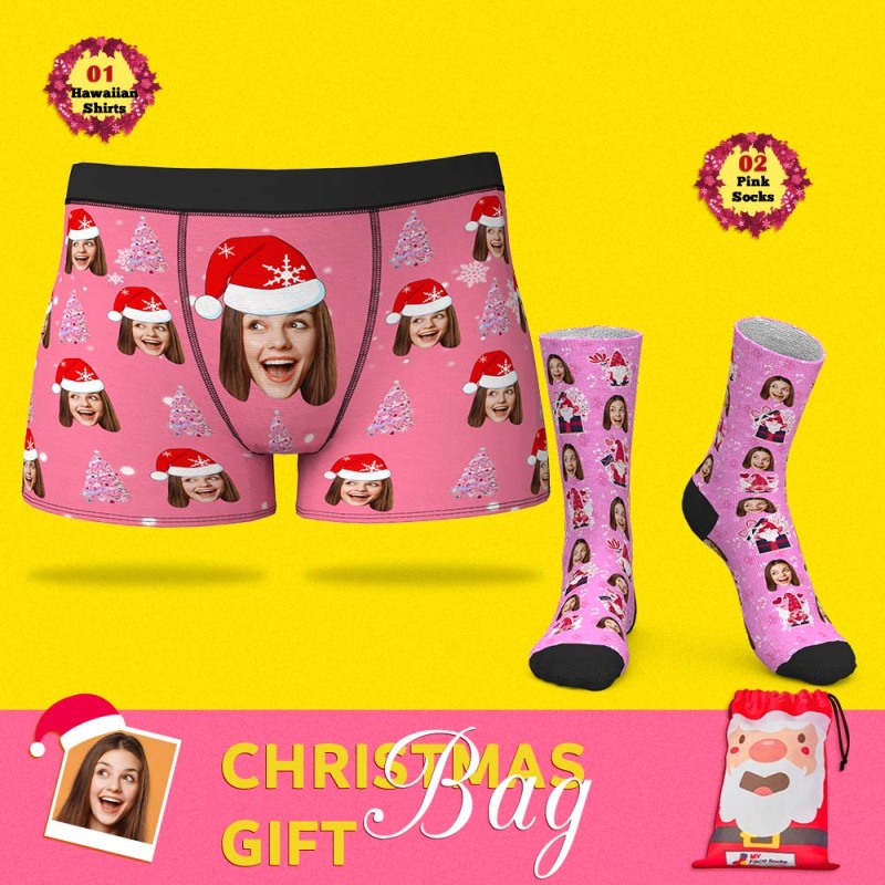 Christmas Gift Bags Custom Face Boxer Shorts And Socks Set For Him Pink Christmas