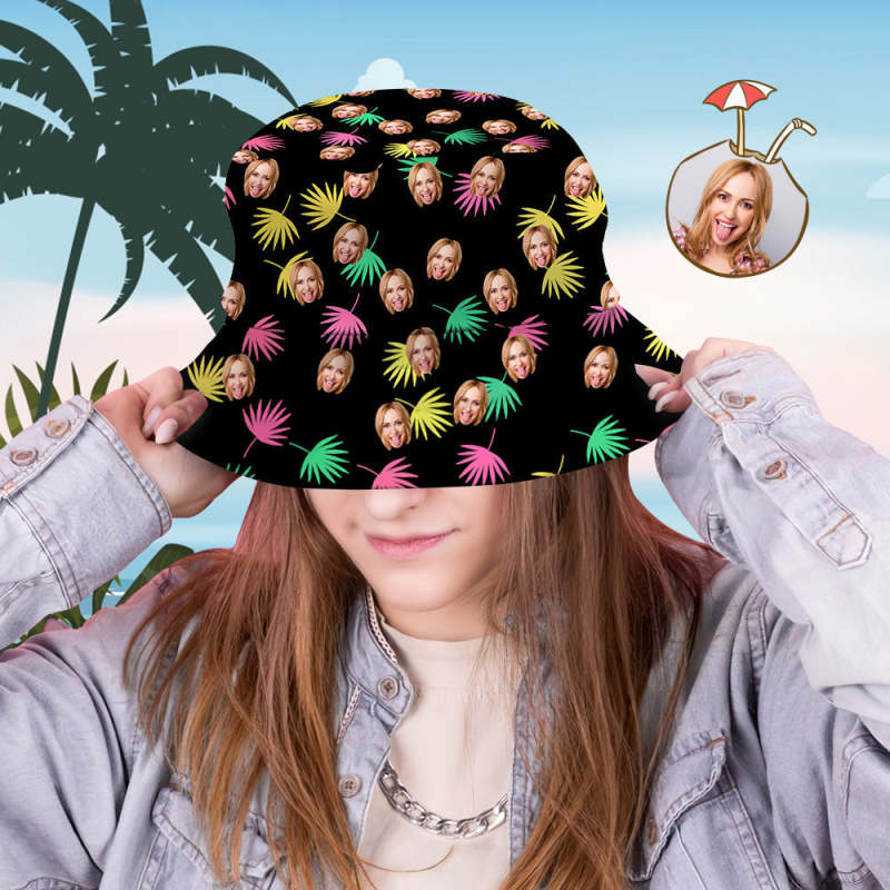 Custom Bucket Hat Personalized Face All Over Print Tropical Flower Print Hawaiian Fisherman Hat - Colorful Leaves
