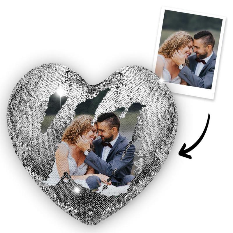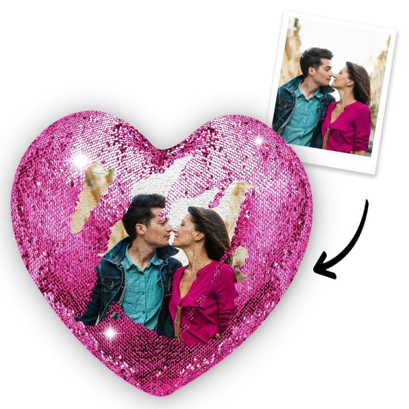 Custom Couple Photo Heart Magic Sequins Pillow Multicolor Sequin Cushion