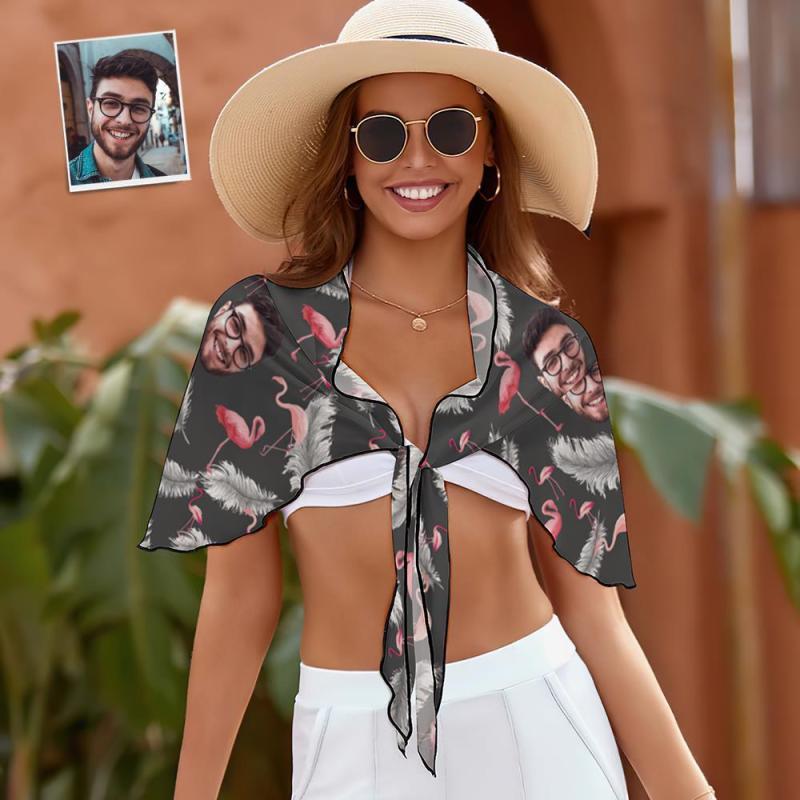 Custom Face Beach Wrap Women Short Sarongs - Flamingo And Feather