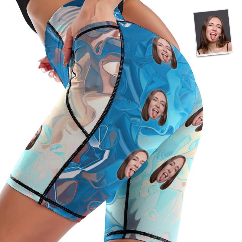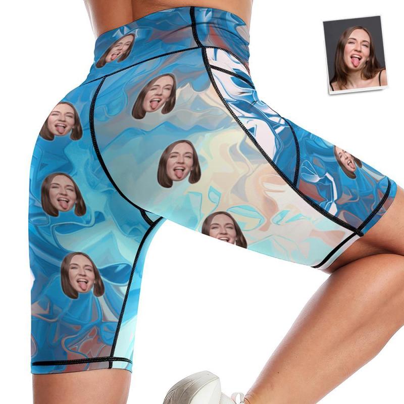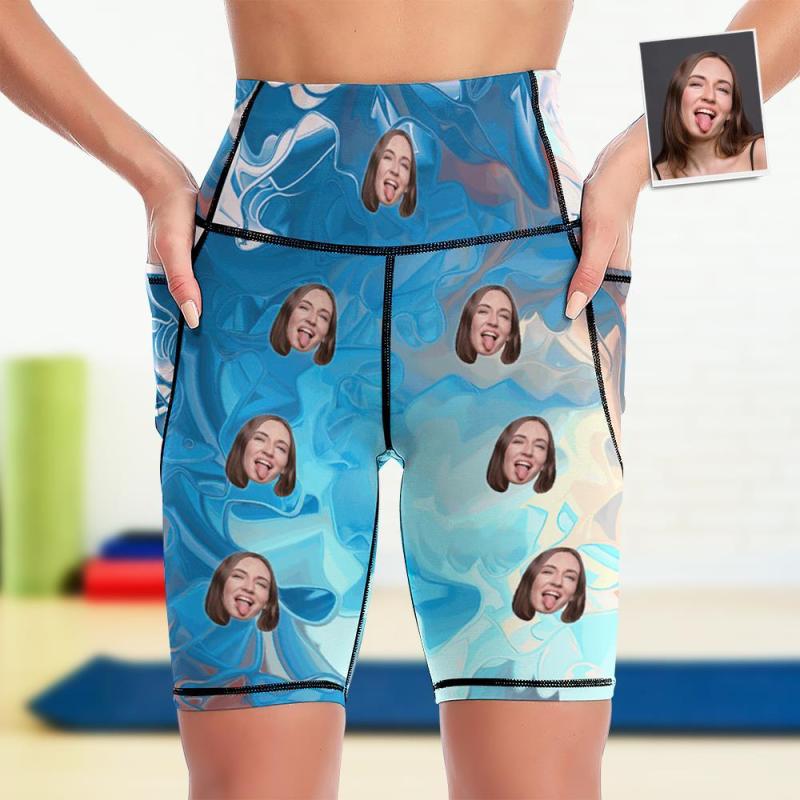 Custom Face Knee Length Tights Women's Yoga Shorts Running Leggings with Pockets - Blue Watercolor
