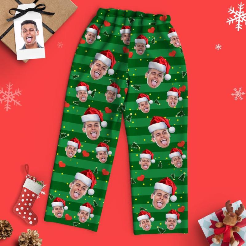Custom Face Pajamas Family Set - Green Stripes Santa Hat