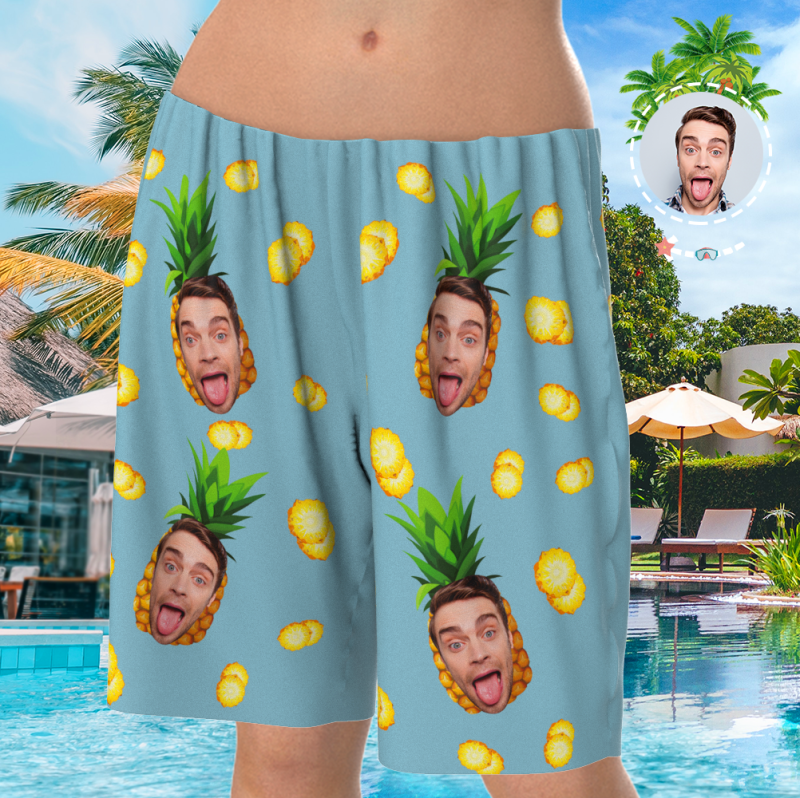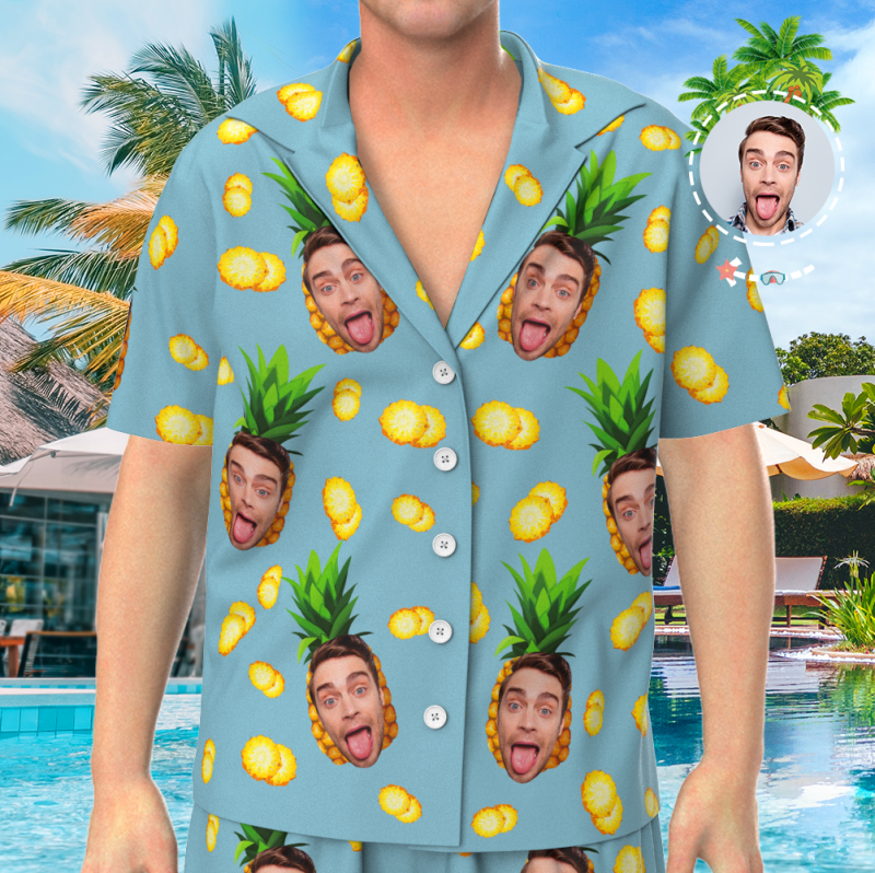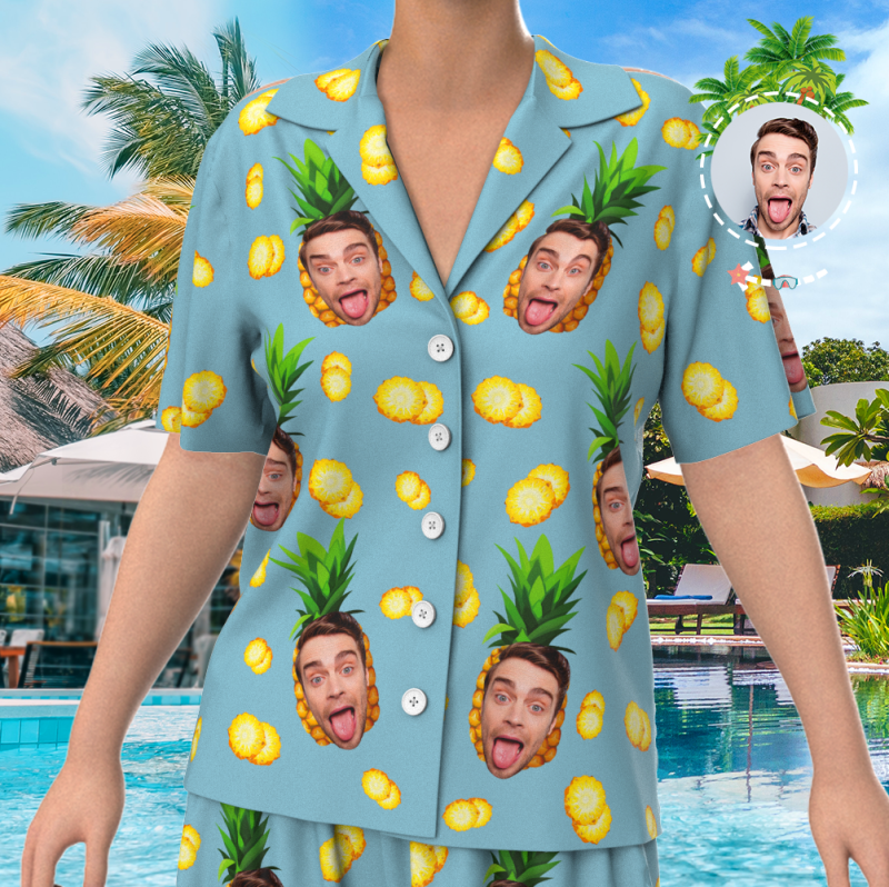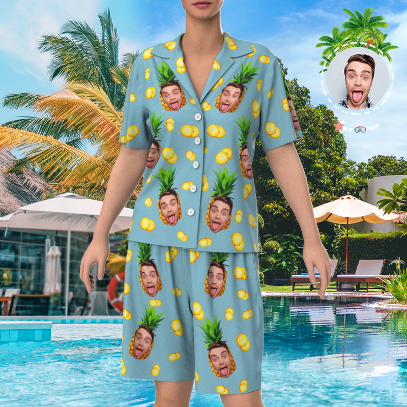 Custom Face On Pajamas Set, Short Sleeve Sleepwear, Button-Down Nightwear - Pineapple