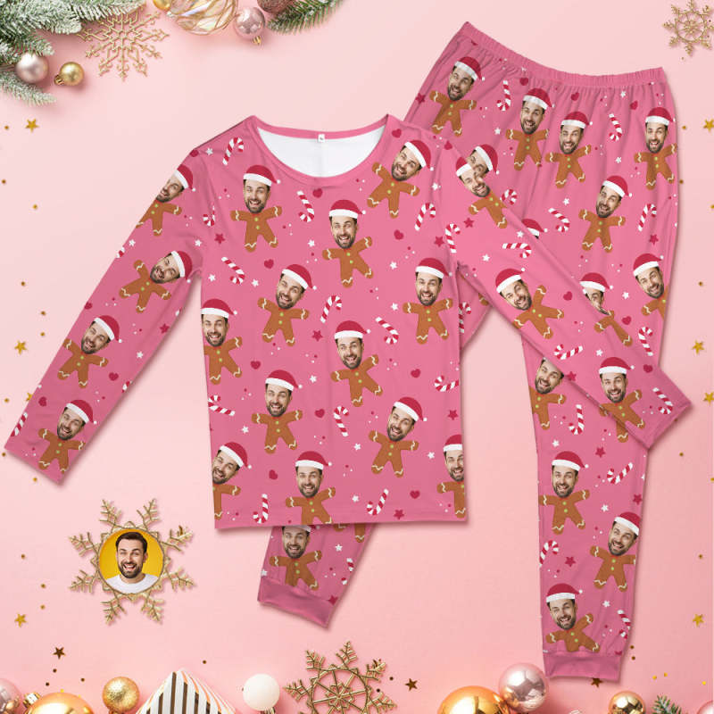 Custom Face Pink Pajamas Personalized Round Neck Gingerbread Christmas Pajamas For Women And Men
