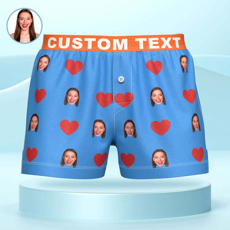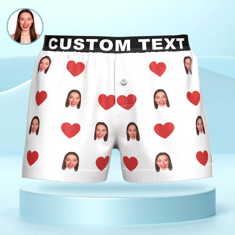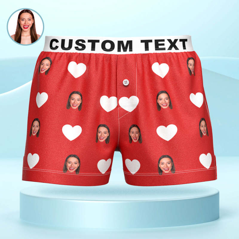 Custom Face Red Heart Design Boxer Shorts with Personalized Text on the Waistband Personalized Underwear for Him
