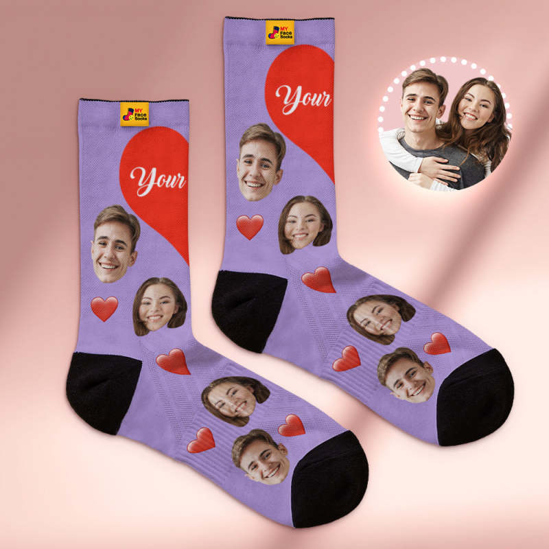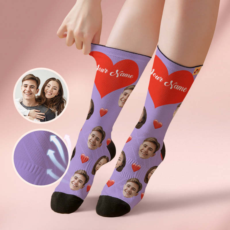 Custom Face Socks Breathable Soft Socks Add Pictures and Name - Heart -Purple