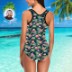 Custom Face Swimwear Women's Photo Slip One Piece Swimsuit Gift For Her - Leaves & Flamingo