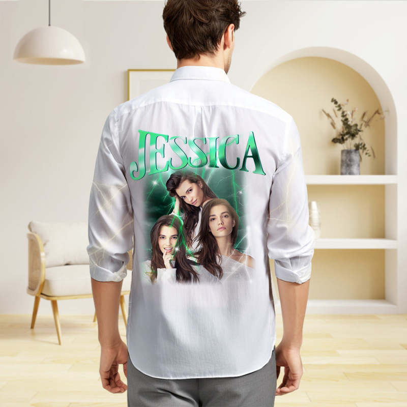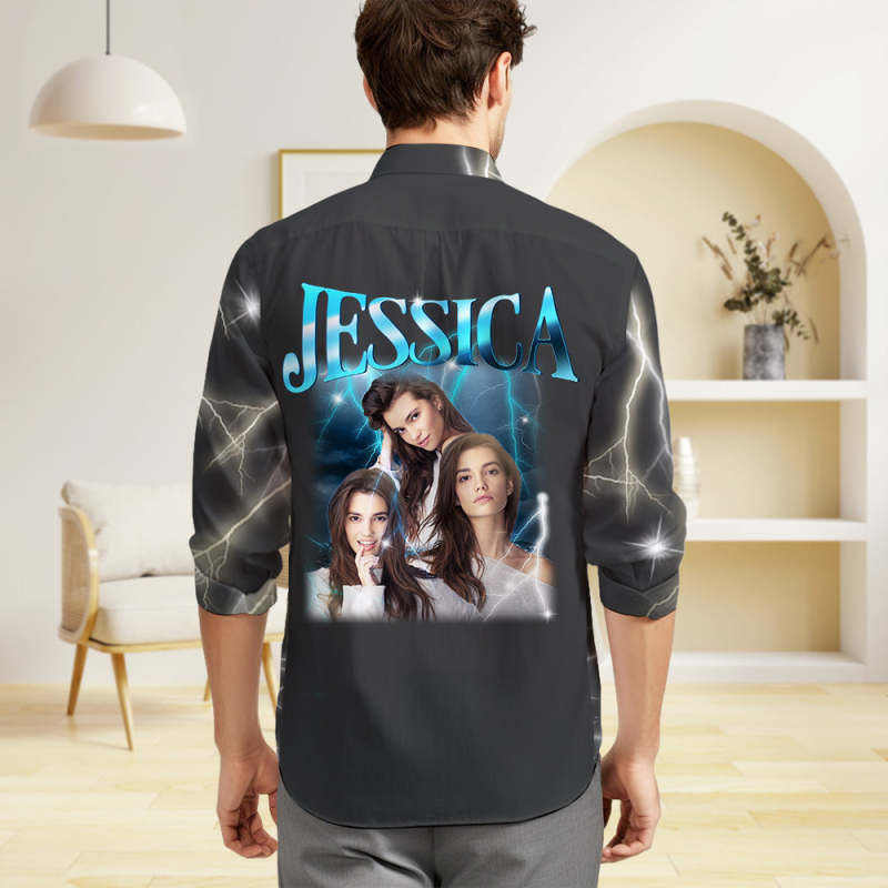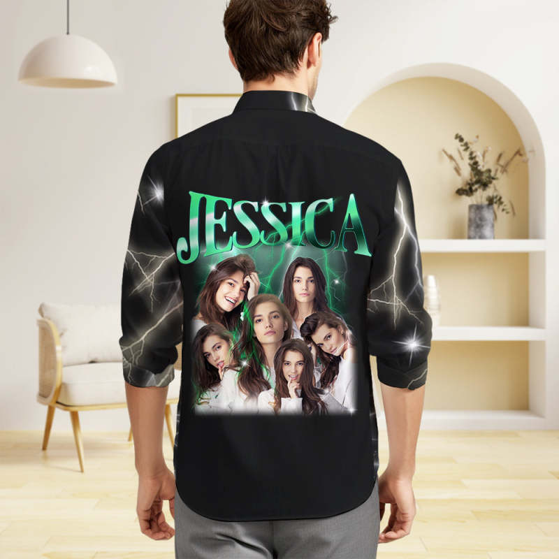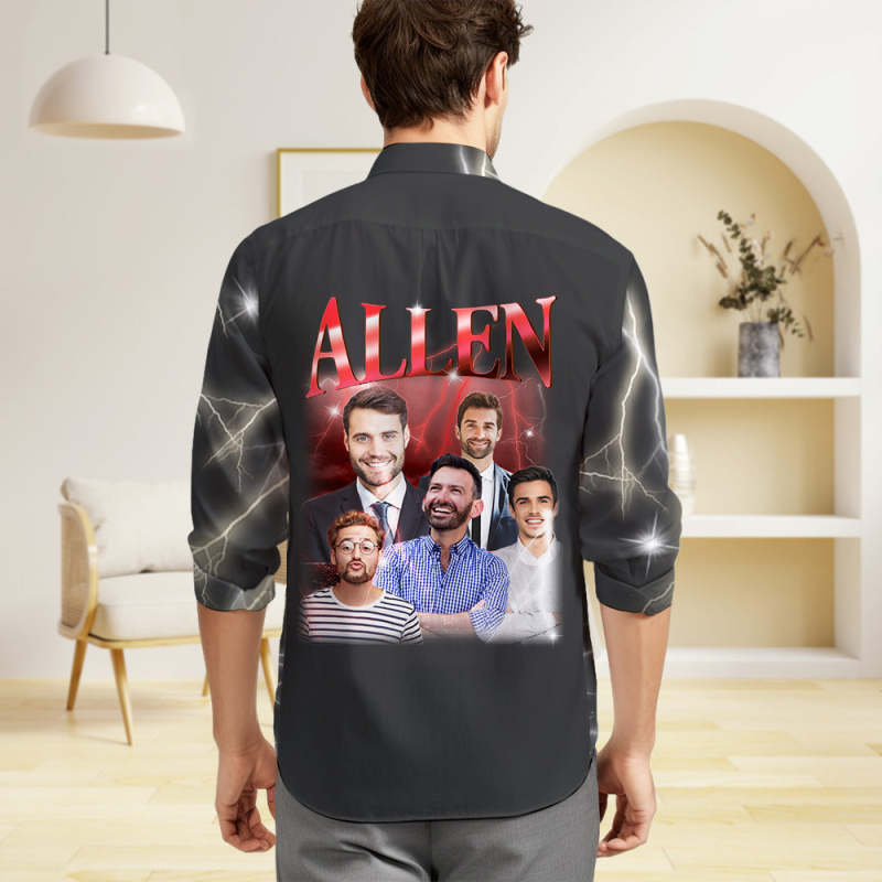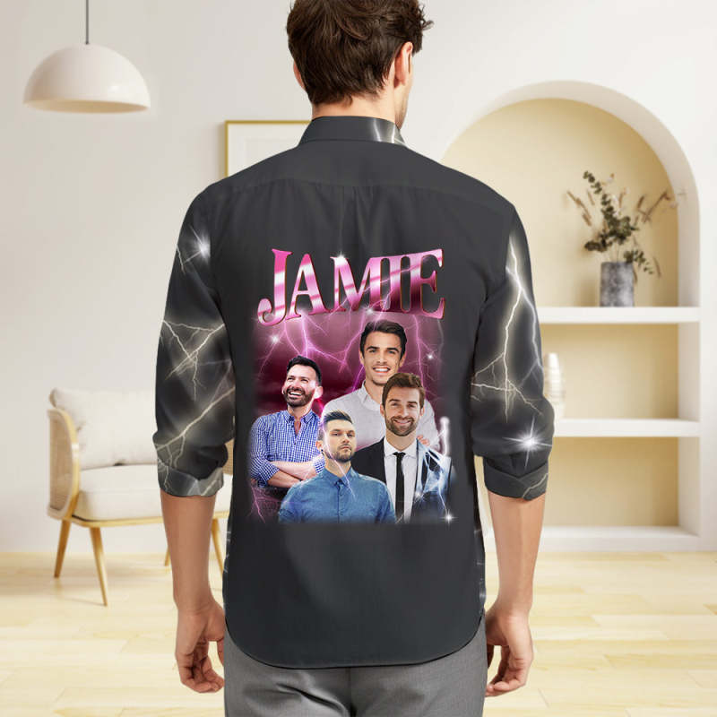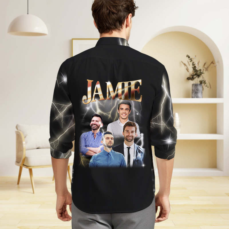 Custom Photo and Text Long Sleeve Shirts Personalized Photo Gift Men's Vintage Personality Lightning Shirts