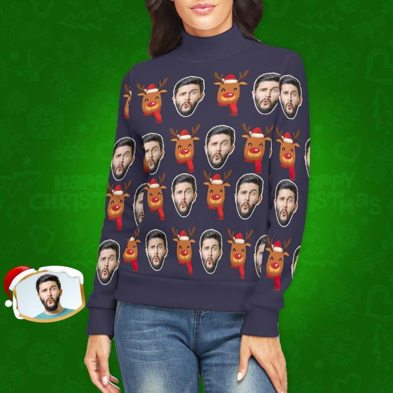 Custom Face Turtleneck for Women Ugly Christmas Sweater Knitted Loose Pullovers - Christmas Rudolph