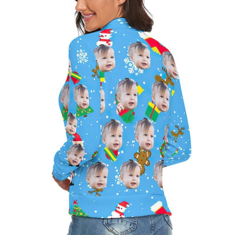 Custom Face Turtleneck for Women Ugly Christmas Sweater Knitted Loose Pullovers - Ice Blue