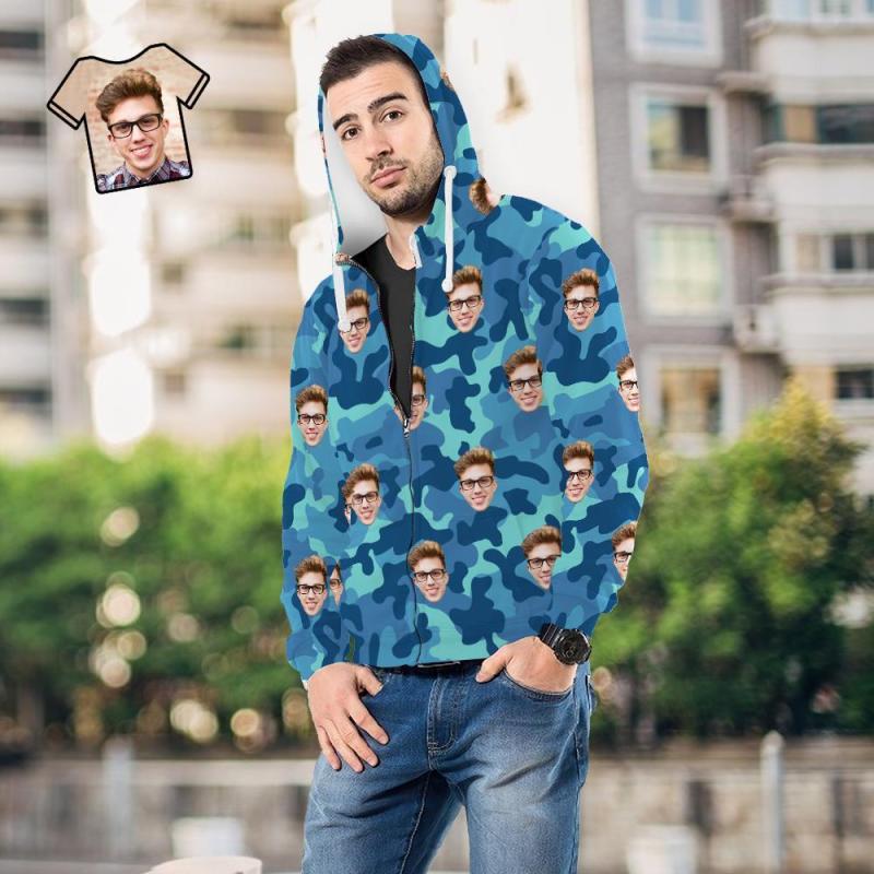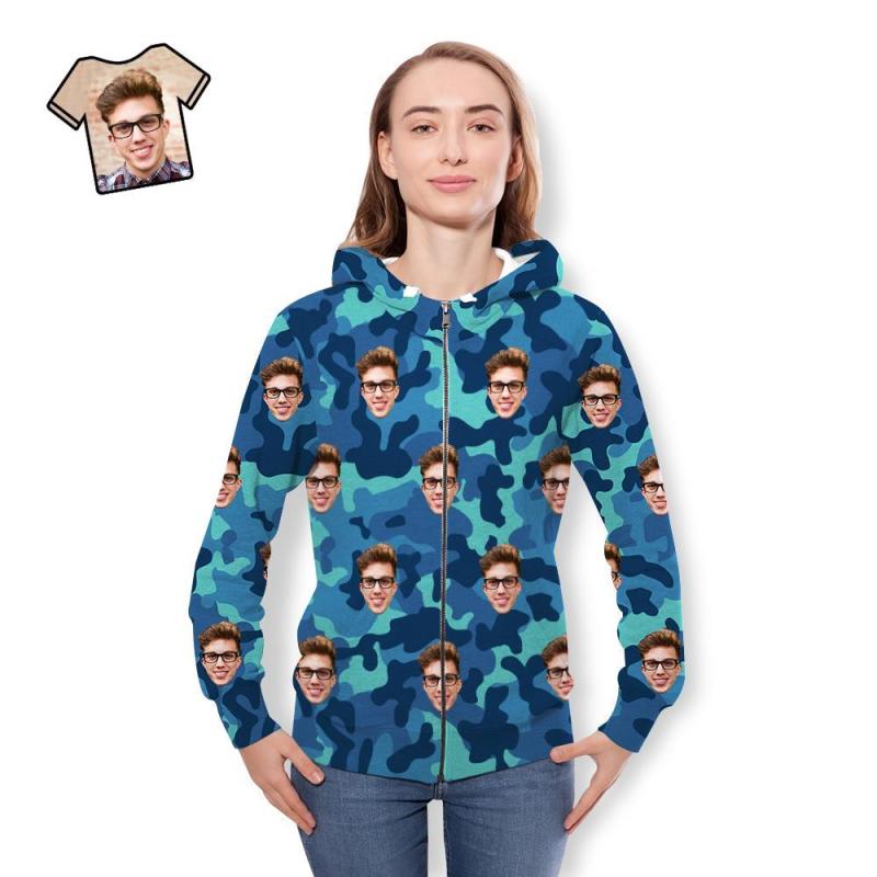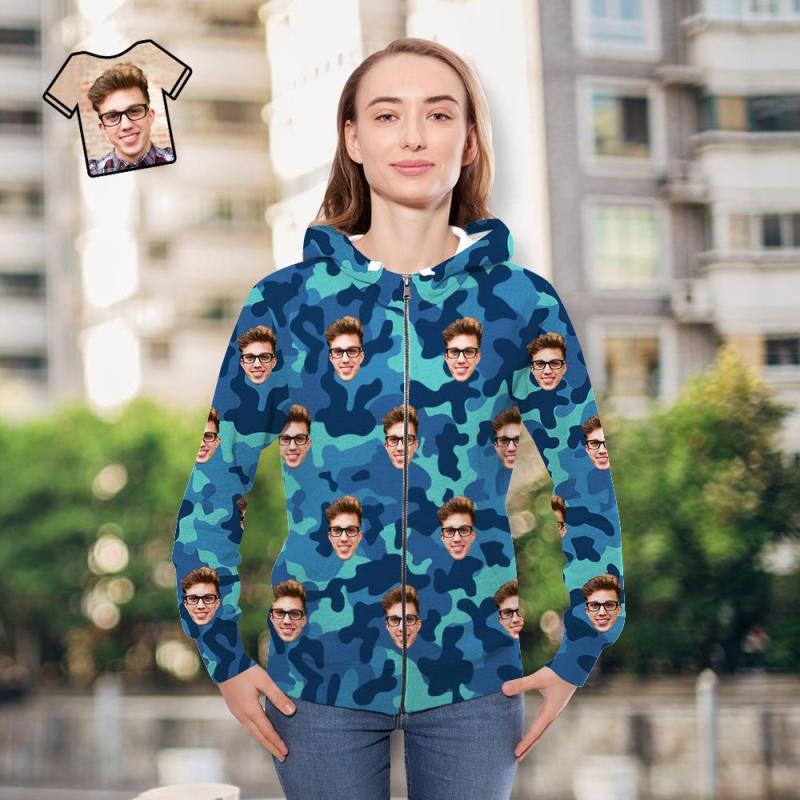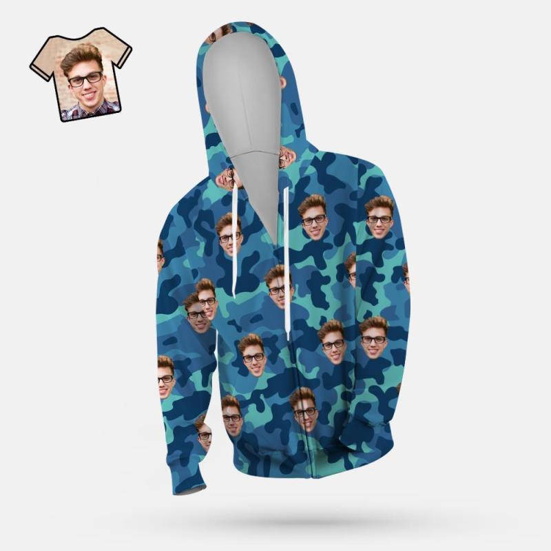 Custom Face Unisex Hoodie Casual Printed Steel Blue Camouflage