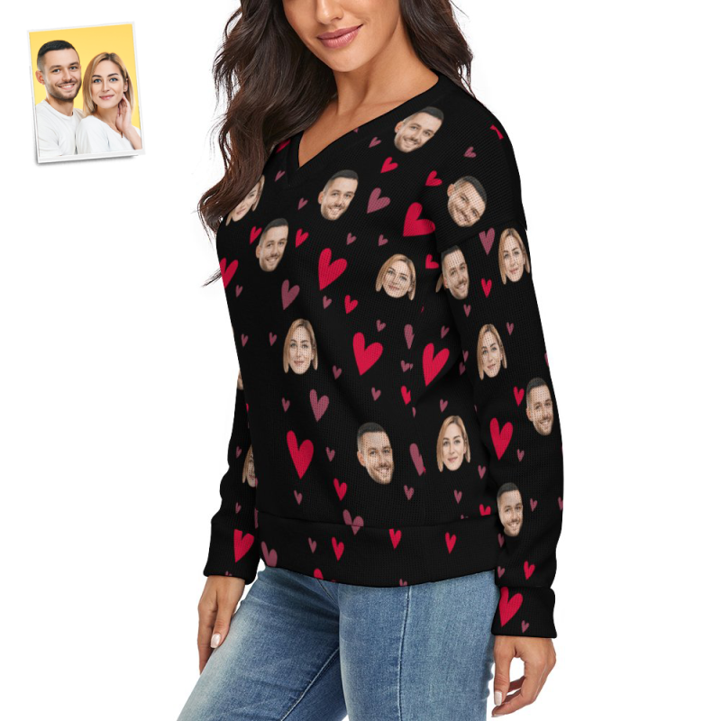 Custom Face Women V-Neck Sweater With Little Heart Couple Theme Spandex Comfortable