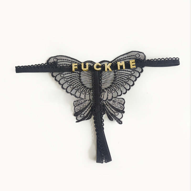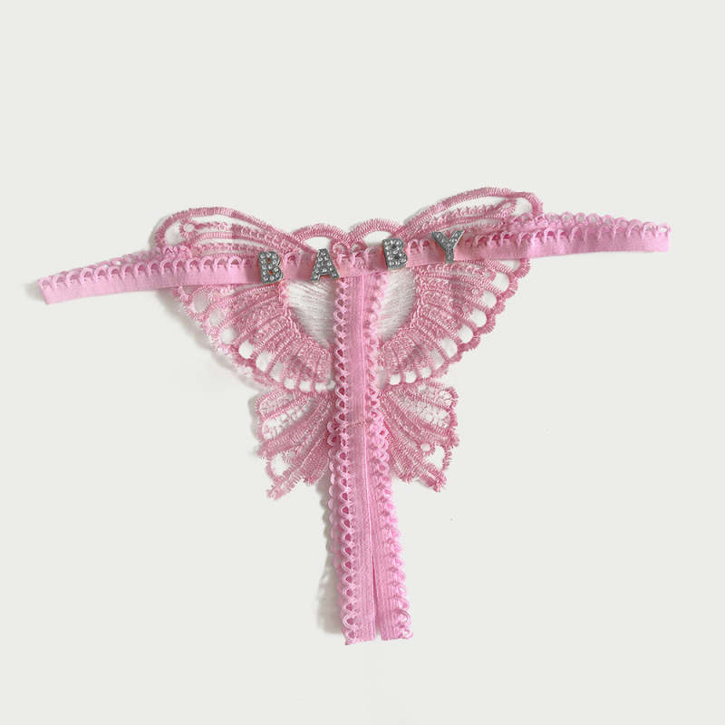 Custom Lace Hollow Butterfly Sexy Low Waist Panty with jewelry Crystal Letter Name Open Cut Thong Underpants Women's Underwear