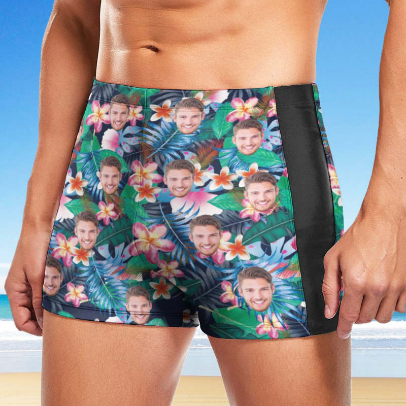 Custom Men's Swim Boxer Shorts, Hawaiian Face Swim Trunks, Peseronalized Swim Briefs - Colorful Flowers