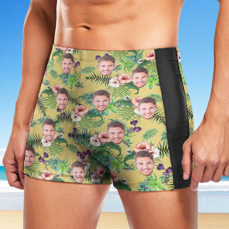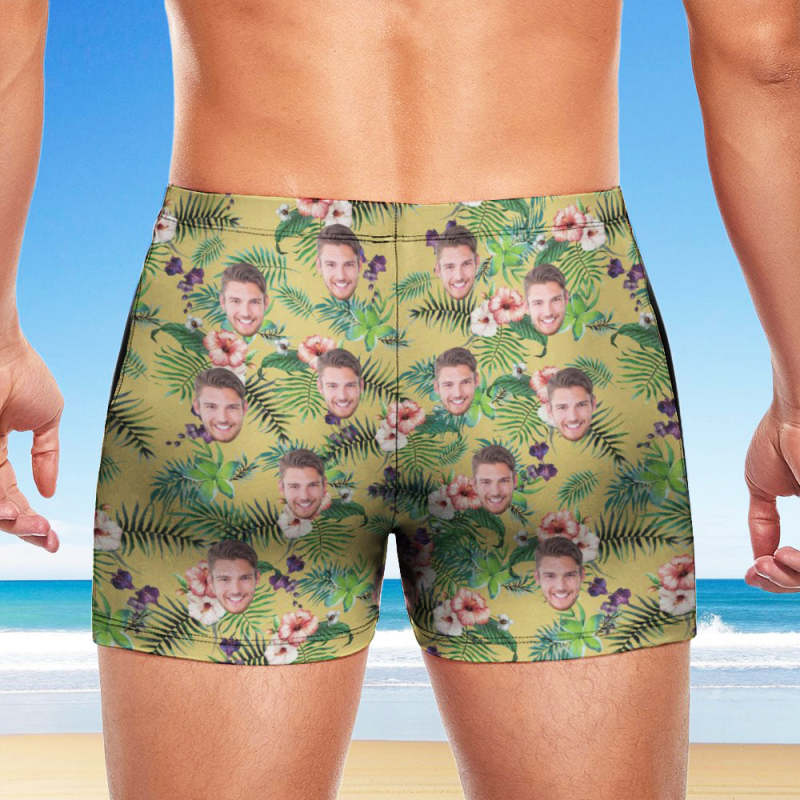 Custom Men's Swim Boxer Shorts, Hawaiian Face Swim Trunks, Peseronalized Swim Briefs - Yellow