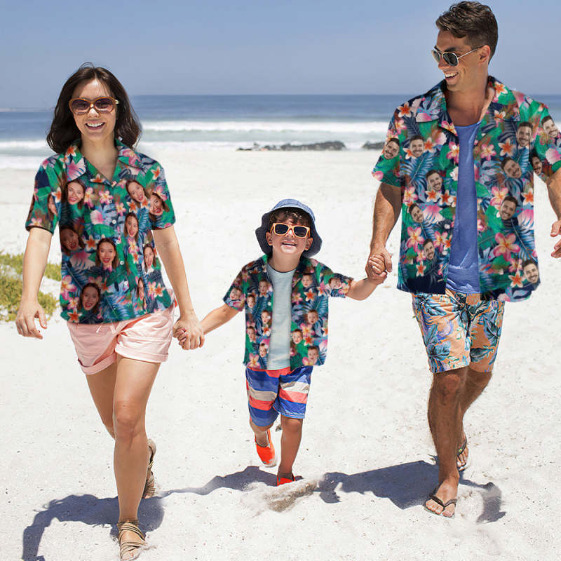 Custom Photo Hawaiian Shirt Couple Outfit Parent-child Wears Personalised Face Hawaiian Shirt Gift Colorful Flowers